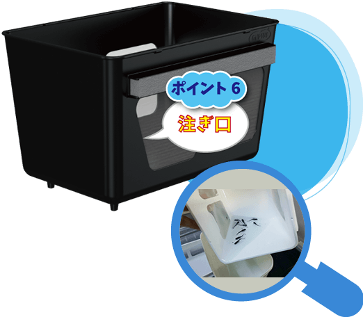 容器側面に、注ぎ口となる斜めの部分を設けてあるので「わけぷか」から別の容器へメダカを移す時も水と一緒にメダカを移動できます